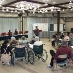 今日は、「こうろまんま」さんに来ていただきました。「こうろ」とは歌のことで、「まんま」とはおかあさんのことだそうです。一番の盛り上がりをみせたのは、ハンドベルです。ドレミファソラシドの音のベルを一人が一音ずつ持って、「きらきら星」と「チューリップ」を演奏しました。皆さん子供の頃に戻った様な笑顔でベルを鳴らし、「今日は本当に楽しかった。」「若い頃にやっててね、何十年ぶりかにやったけど、ちゃんと出来て嬉しかった。」などの喜びの声が聞かれました。紙芝居の「おさんぎつね」やフルートの演奏などバリエーションも豊富でとても楽しい誕生会になりました。利用者さんの楽しそうな笑顔がやっぱり一番ですね。