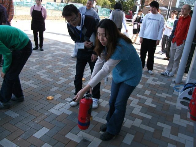 今回は春日井消防署より水消火器をお借りして、消火訓練も行いました。