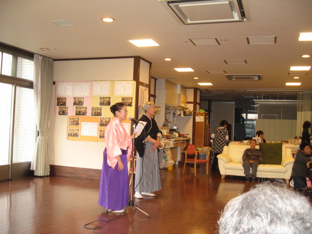 デイサービスで毎月第一火曜日に行われる詩吟教室。本年の第一回目は踊りもあわせてご披露して
