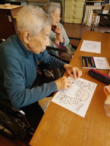 早いものでもう少しで今年が終わろうとしています。間もなく12月最大のイベントのクリスマスやって来ます。あさひが丘3階西町南町では、クリスマスツリーを飾り雰囲気漂う中で、サンタクロース、トナカイ、クリスマスリースの塗り絵を行いました。同席の方と色を相談しながら塗られたりする姿が多々見られ良かったです。塗り絵が終わった後は、クリスマスリースに見えるバームクーヘンや、そりに見えるマドレーヌ等を美味しくいただきました。少しですがクリスマスの雰囲気を味わって頂けたかと思います。今後も季節や雰囲気を一緒に感じることが出来るようなレクリエーションの企画に努めていきます。