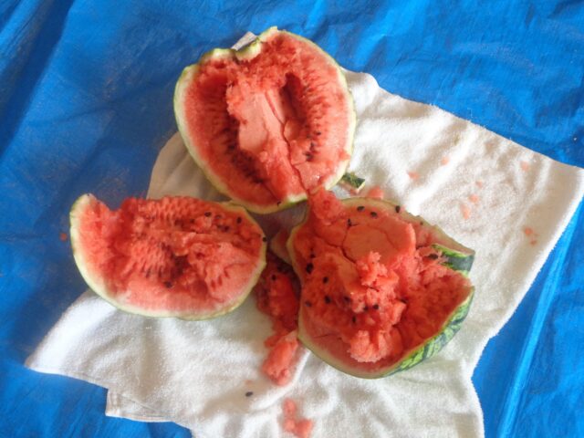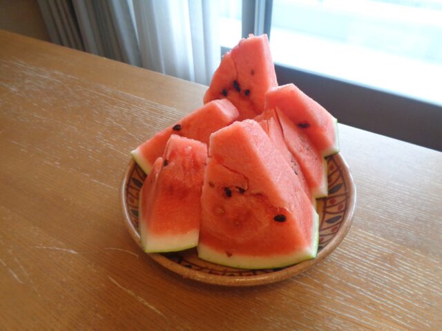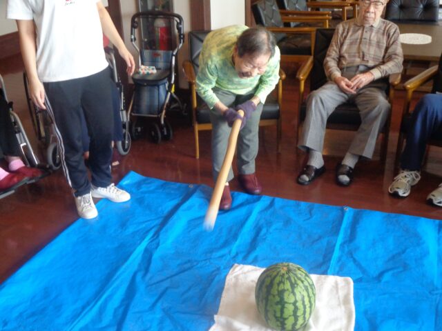 暑い日が続いていますが、あさひが丘3階西町南町ではスイカ割りを行いました。大きな丸いスイカに皆さん驚かれていました。スイカを囲んで1人ずつ棒で叩いてもらいましたが、皆さんとても力が強くスイカもすぐに割れてしまうほどでした。終了後は割ったスイカを召し上がって頂き「美味しい」と言っていただけました。暑い夏に涼しい気分を味わって頂けたと思います。