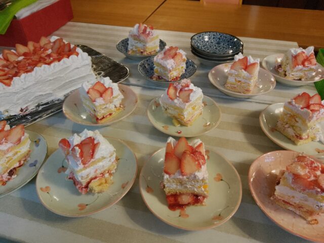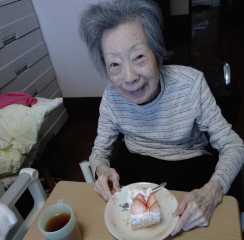 あさひが丘4階北町東町では、月の終わりに久しぶりにカラオケを行いました。入居者様に好きな曲を選んで頂き歌ったり手拍子をしたり足を使って踊ったりと楽しくカラオケをされていました。カラオケの後には支援員手作りのケーキを召し上がって頂きました。とても大きなケーキでしたが、皆様ペロッと完食されていました。