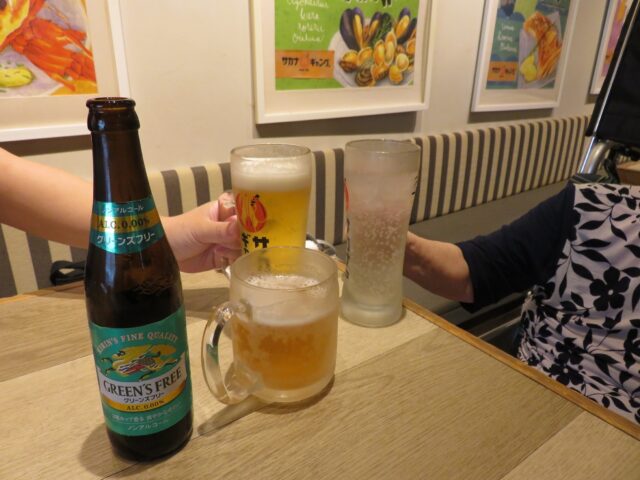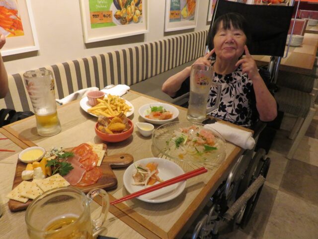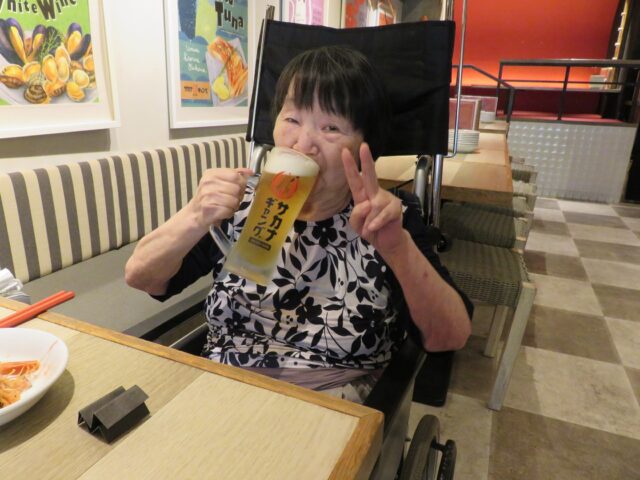 こんにちは。あさひが丘2階北町東町です。入居した頃から「飲みに行きたい」「一緒に飲みたい!」とおっしゃっていた希望を叶えるために勝川にあるサカナギャングというお店に飲みに行ってきましたぁ!コロナもあり、外出レク自体が久々で職員も緊張しましたが、とても楽しい時間を過ごすことができました。昔の話や施設の話をしながら、ビールも進み、本人様も大満足!!気持ちも高ぶり、他のお客やお店のスタッフに話しかけたりもして、終始笑って楽しいお酒の時間となりました。また機会を作って行きたいですね♪