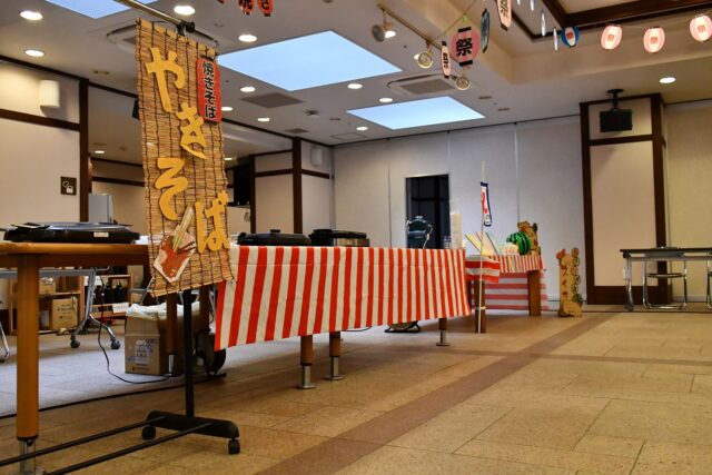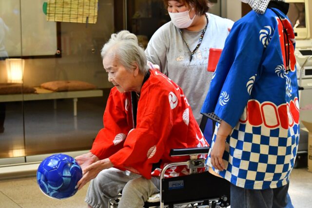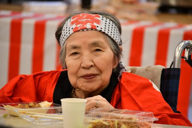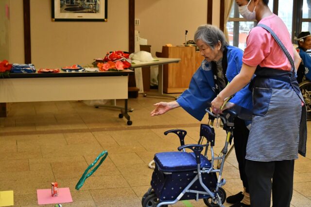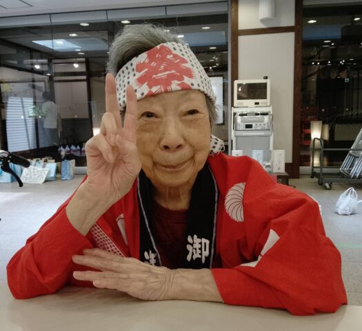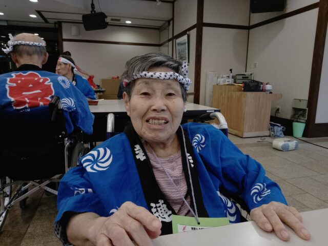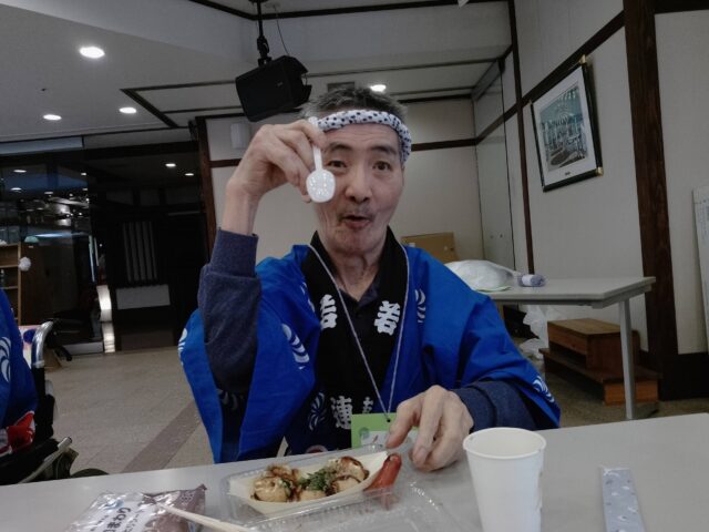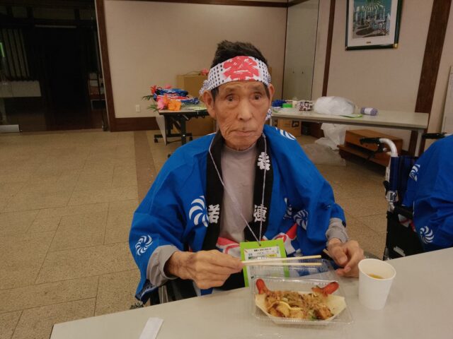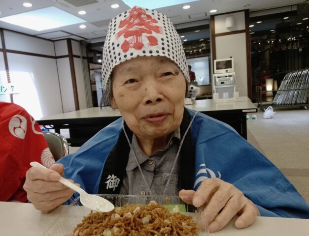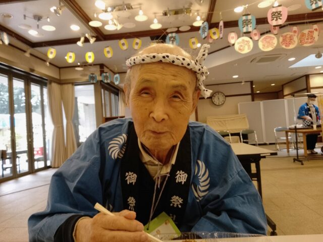 あさひが丘4階北町東町では1階の地域交流スペースを飾りつけし年に一度の夏祭りを開催しました!入居者様・支援員とも法被を着て準備万端。祭囃子と共にお祭りスタートです。目の前で焼けていくたこ焼きと焼きそば、景品を狙って盛り上がっているゲームコーナー、夏らしいかき氷とスイカのフルーツポンチ。皆様「懐かしいね」「焼きそば食べるの楽しみにしてたよ!」「おかわりしたい!」「かき氷冷たくておいしい!」と楽しまれていました。来年はどんな屋台が並ぶかな?お楽しみに!